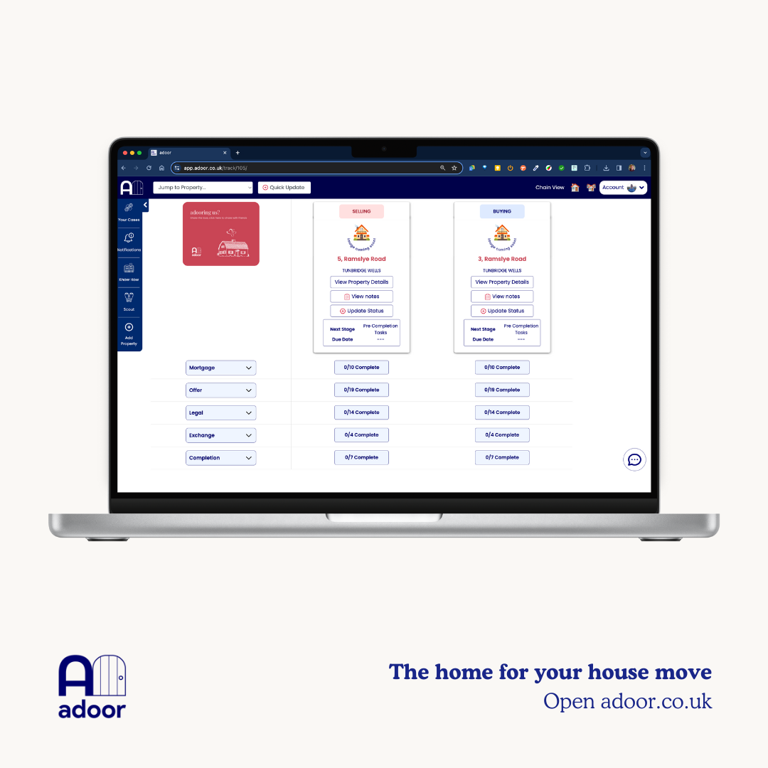 We built adoor to solve the biggest challenge we see in the house moving process - Communication. Information about the move is often siloed in separate systems and there wasn’t a user-friendly way to see where you are in the process without having to call or email. Whilst Conveyancers and Estate Agents are handling ever-increasing caseloads with transactions taking longer too.