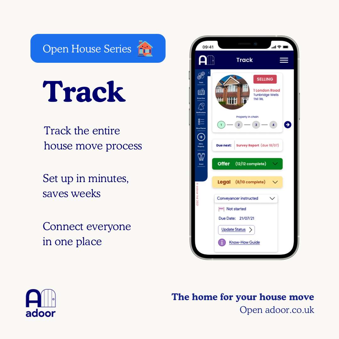 For Conveyancers & Estate Agents: adoor is your free client-facing platform connecting everyone involved to track the house move. That seamlessly works with your existing systems (no migration needed!).
